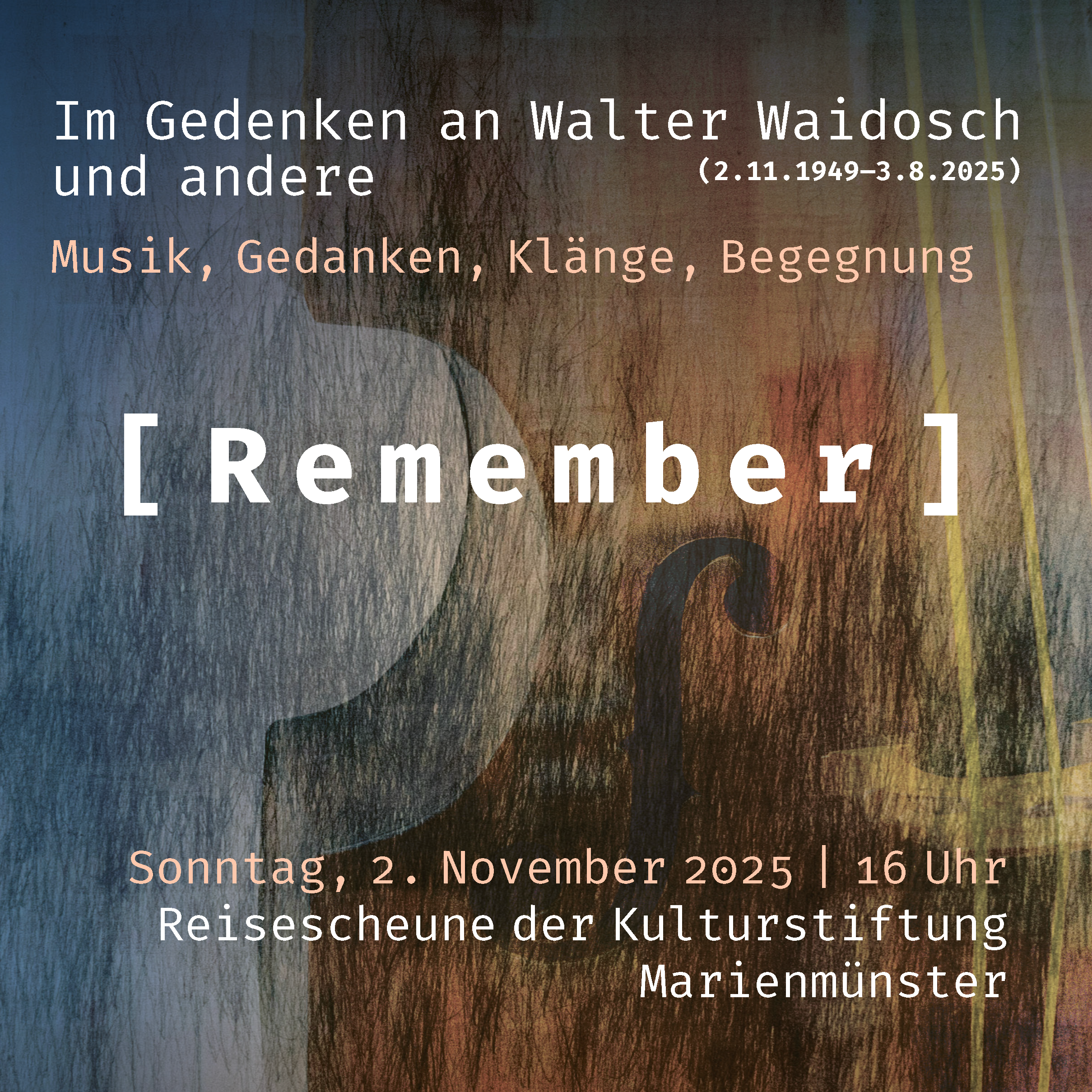 Gedenkkonzert für verstorbene Wegbegleiter, u. a. für Walter Waidosch. Der Musiker und Geigenbauer war langjähriger Leiter der Burg Sternberg, regelmäßiger Gast in Marienmünster und Impuls- und Ideengeber in der Region. Es gibt Zeit zum Zu- und Nachhören, Zeit zum Erinnern und Zeit für Gespräche bei Kaffee und Kuchen.
